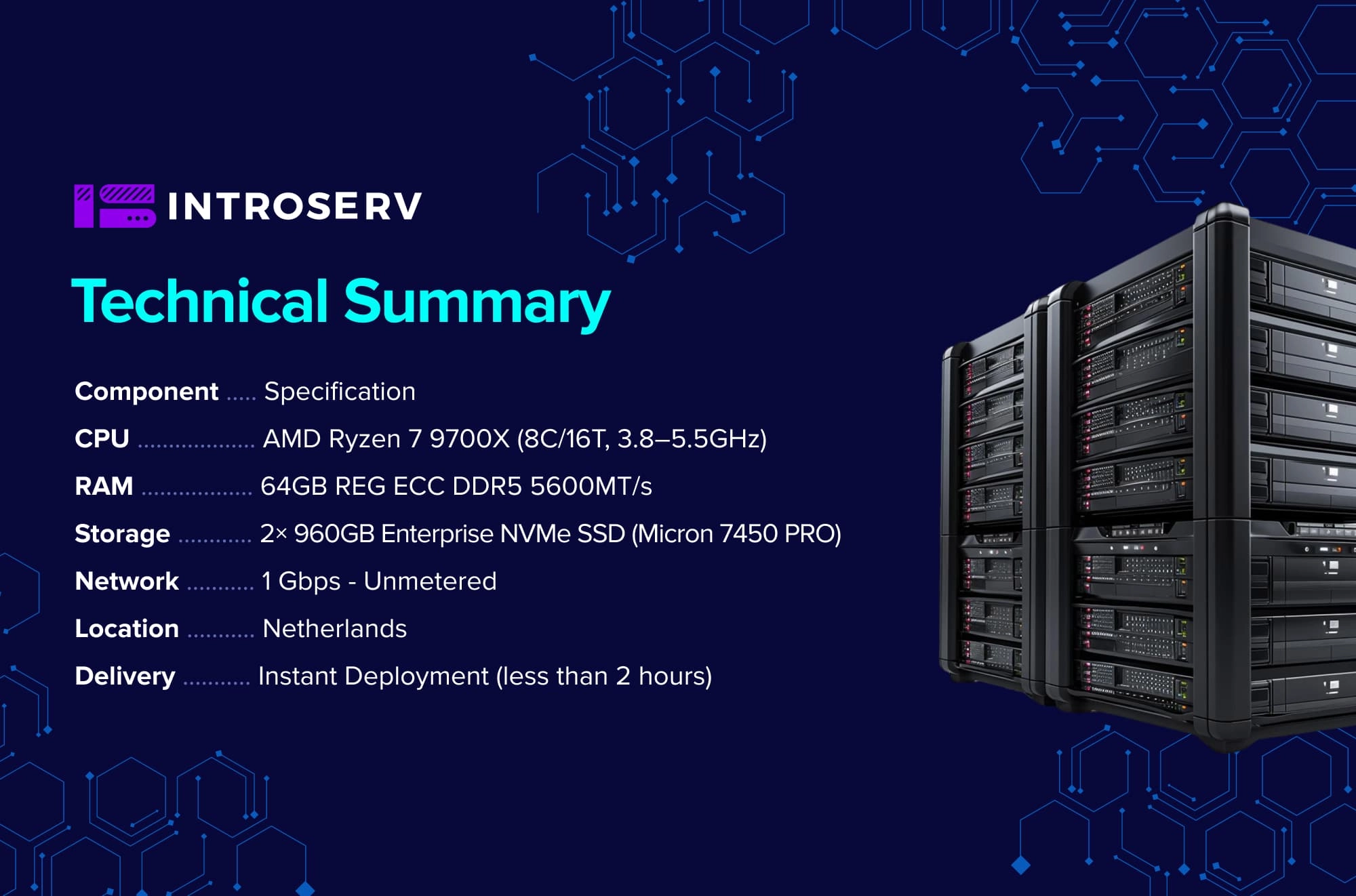 Non aspettate giorni per la configurazione del vostro server: grazie alla tecnologia di deployment istantaneo di INTROSERV, il vostro server dedicato DC2 INSTANT 52 è pronto a partire in meno di 2 ore. Aggiornate oggi stesso la vostra infrastruttura e sperimentate la miscela perfetta di potenza, prestazioni e affidabilità con DC2 INSTANT 52.