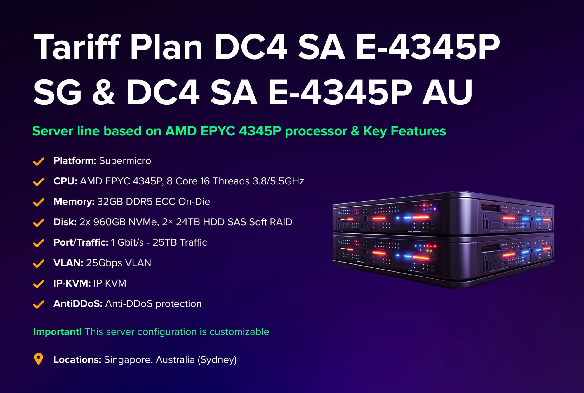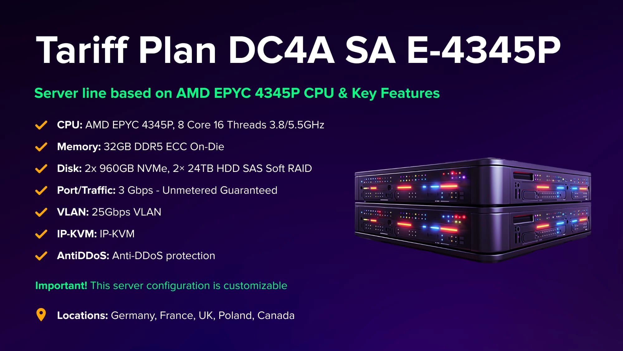 Zasilany przez AMD EPYC 4345P (8C/16T, 3,8-5,5 GHz) z 32 GB pamięci DDR5 ECC. Pamięć masowa obejmuje 2 dyski SSD NVMe o pojemności 960 GB zapewniające szybkość i 2 dyski twarde o pojemności 24 TB z miękkim RAID do przechowywania danych o dużej pojemności. Serwer ten zapewnia szybką i niezawodną wydajność na potrzeby wirtualizacji, baz danych i obciążeń korporacyjnych. Funkcje obejmują niezmierzony ruch 3 Gb/s, VLAN 25 Gb/s, IP-KVM i ochronę przed DDoS, z preinstalowanymi różnymi systemami operacyjnymi.