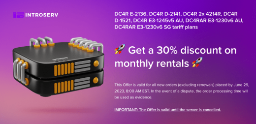 Uzyskaj 30% zniżki na miesięczny wynajem. Ta OFERTA dotyczy następujących planów serwerów: DC4R E-2136, DC4R D-2141, DC4R 2x 4214R, DC4R D-1521, DC4R E3-1245v5 AU, DC4RAR E3-1230v6 AU oraz DC4RAR E3-1230v6 SG!
