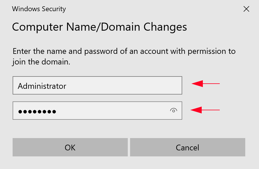 Krok 3. W wyświetlonym oknie wprowadź login i hasło użytkownika z grupy administratorów domeny. Wcześniej w tym podręczniku ustawiliśmy hasło dla konta Administrator, które jest członkiem grupy administratorów domeny.