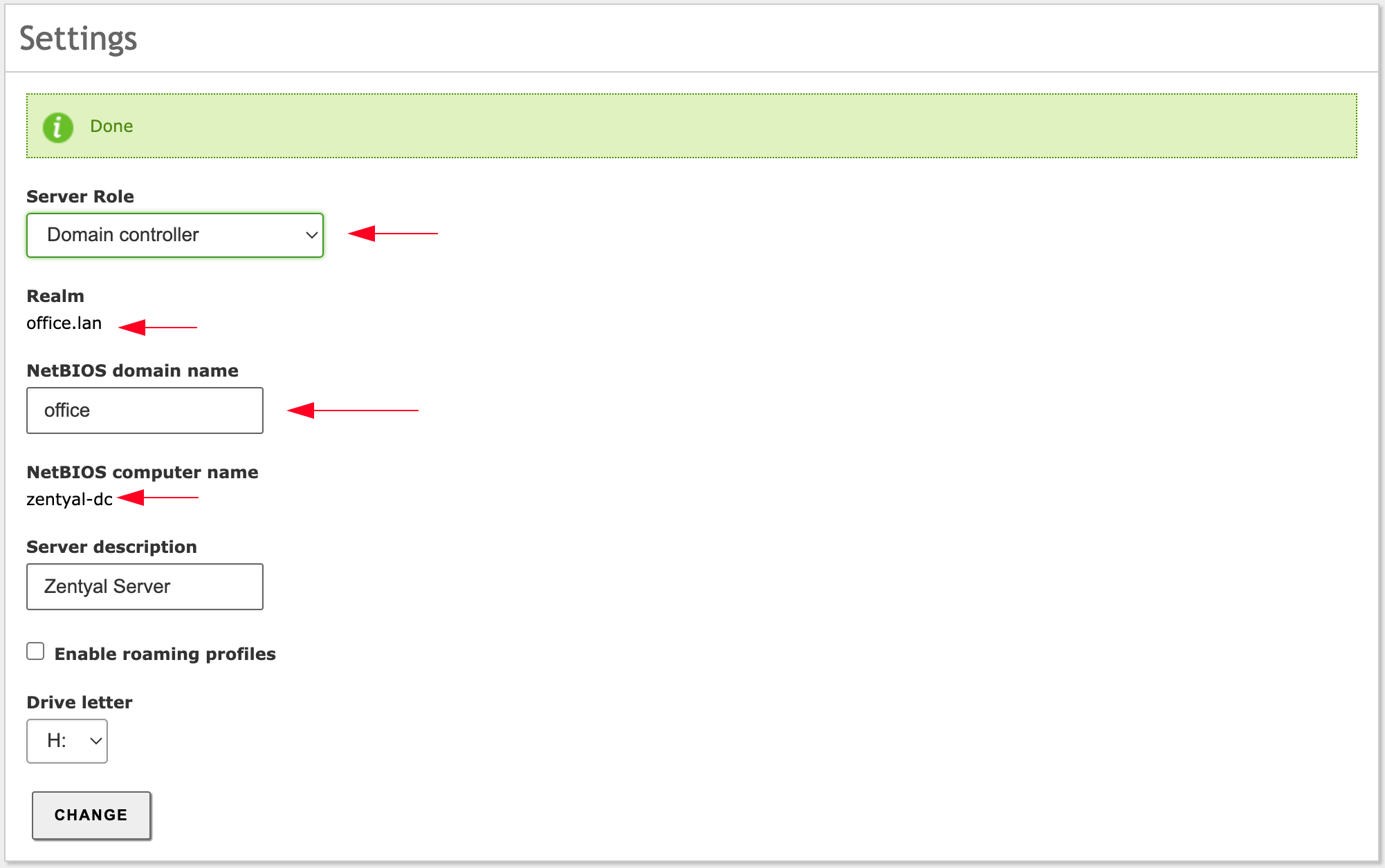 - Zentyal jest zainstalowany z następującymi modułami: DNS, Kontroler domeny i udostępnianie plików oraz Użytkownicy i komputery.