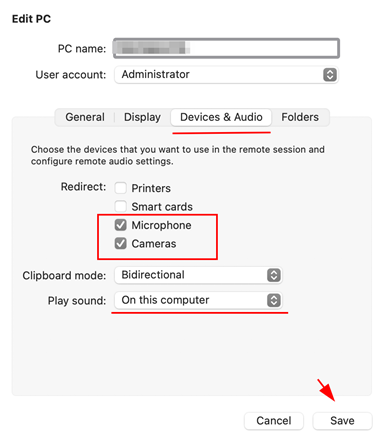 3. Включите доступ к камере и микрофону в приложении Microsoft Remote Desktop: