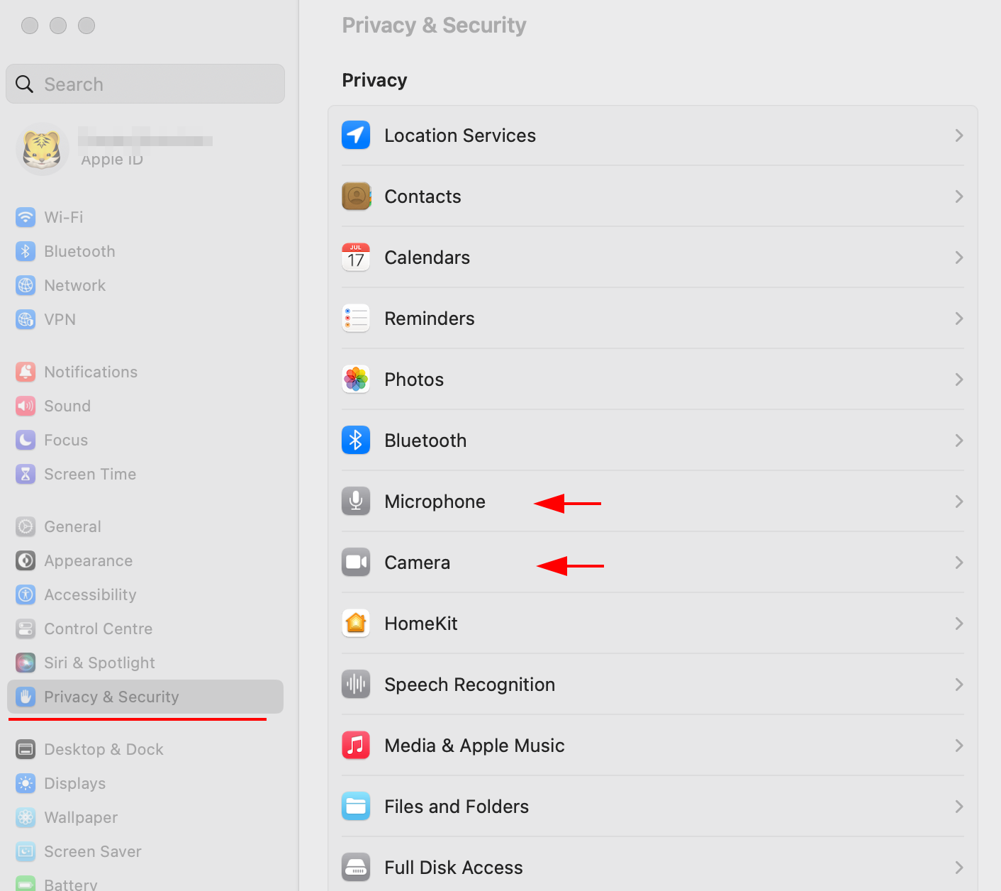 2. Включите доступ в разделе Микрофон и камера, если он отключен: