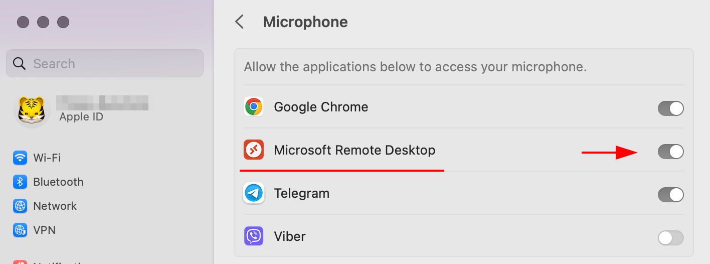 1. Дайте разрешение приложению Microsoft Remote Desktop на доступ к камере и микрофону: System Settings... -> Privacy & Security -> Microphone (Camera):
