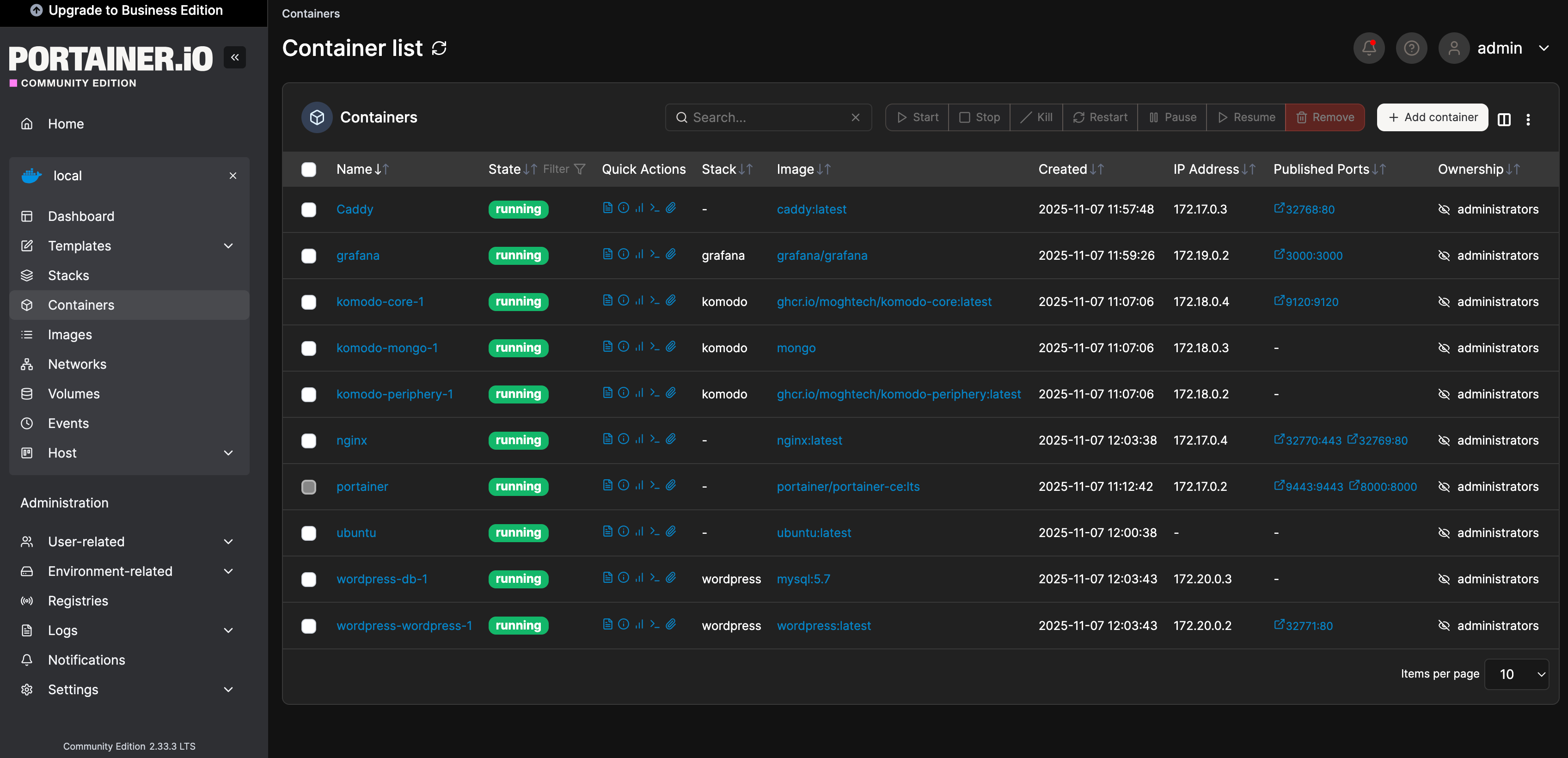 Komodo je novejši projekt, vendar ima precej drugačen pristop. To ni le "plošča za upravljanje vsebnikov", temveč celovita platforma DevOps, ki temelji na Dockerju in Docker Compose.