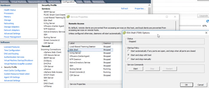 Odjemalec Windows za posamezne gostitelje ESXi lahko še vedno uporabljamo za konfiguracijo nekaterih nastavitev (ne vseh). Žal boste morali za povezavo s strežnikom vCenter uporabiti spletni odjemalec vSphere (ki temelji na tehnologiji Flash) ali odjemalec, ki temelji zgolj na tehnologiji HTML 5. Povezati se morate z gostiteljem in iti v razdelek Configuration > Security Profile > Services, nato klikniteProperties in s seznama izberite ESXishell.