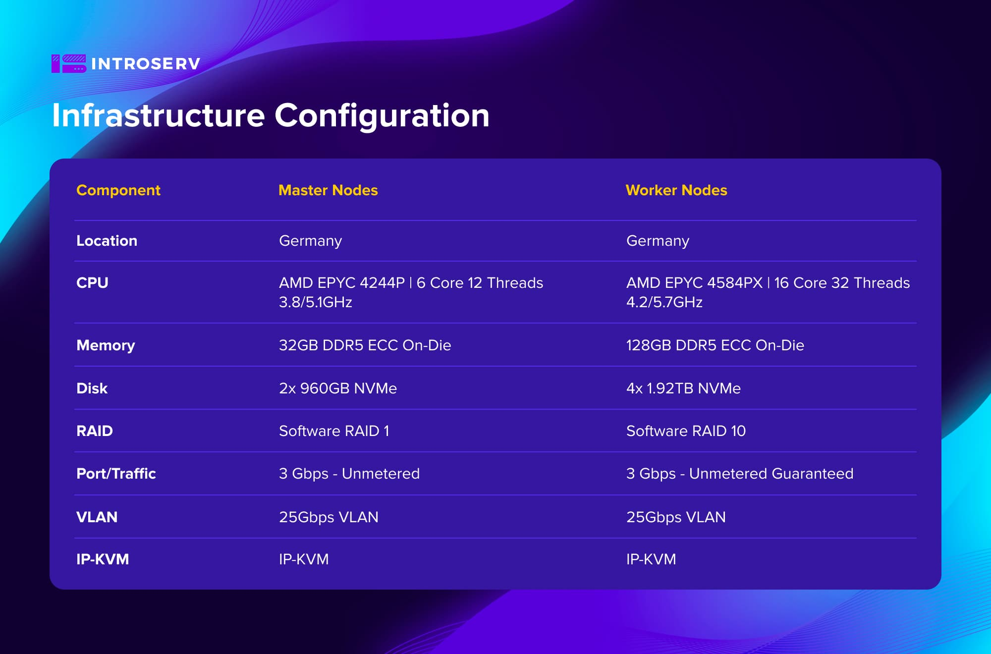 Kot odgovor na zahtevo po platformi z največjimi vhodno-izhodnimi metrikami in računsko močjo za aplikacijo za prekodiranje videoposnetkov je ekipa INTROSERV-a namestila visoko zmogljivo gručo Kubernetes na namenskih strežnikih.