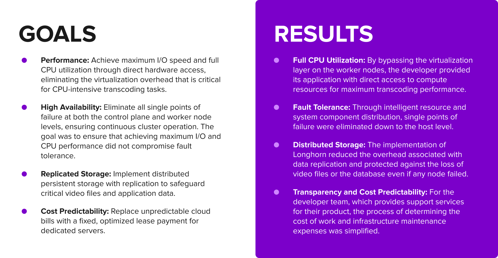 Porazdeljeno shranjevanje: Za zaščito kritičnih video datotek in aplikacijskih podatkov je bilo uvedeno porazdeljeno shranjevanje Longhorn z replikacijo. Ta rešitev je zmanjšala splošne stroške, povezane z repliciranjem podatkov, in zagotovila varnost pred izgubo podatkov tudi v primeru odpovedi katerega koli vozlišča.