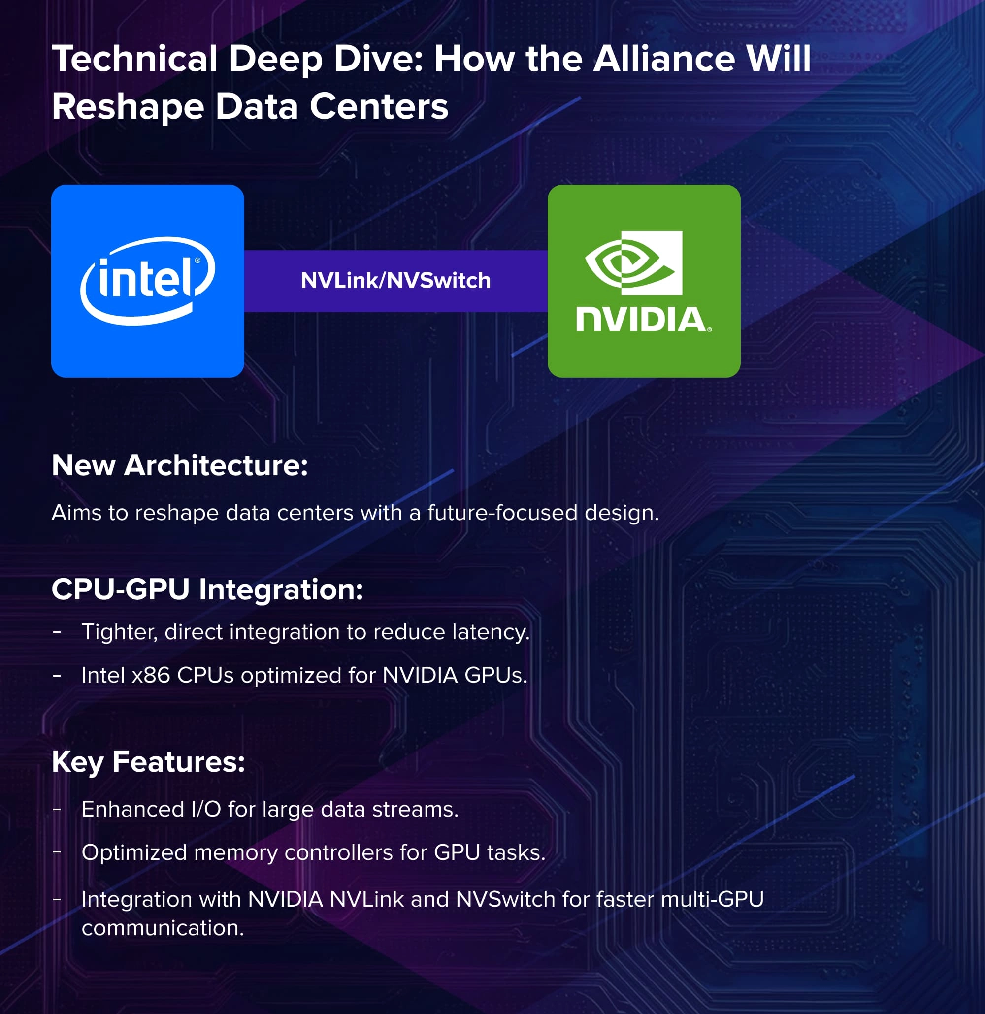 Pri obremenitvah umetne inteligence in HPC se ozka grla pogosto pojavijo med prenosom podatkov med procesorji in grafičnimi procesorji. Novo partnerstvo Intel NVIDIA to rešuje s tesnejšim in bolj neposrednim povezovanjem. Pri tem partnerstvu ne gre za posamezen izdelek, temveč za novo arhitekturo za prihodnost računalništva. Jedro tega sodelovanja je na dveh ključnih področjih: