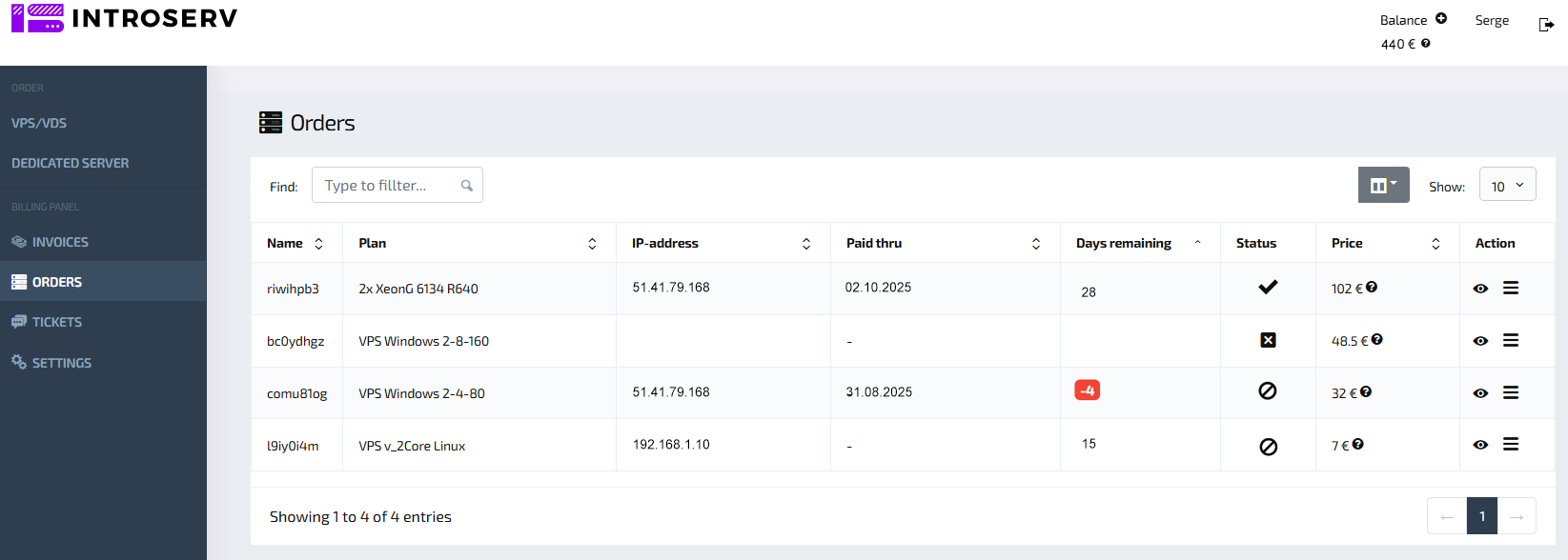 Розділ "Замовлення" призначено для управління всіма сервісами та продуктами, придбаними в INTROSERV. Тут користувачі можуть переглядати активні, виконані, призупинені та скасовані замовлення, керувати їх параметрами та відстежувати статус виконання.